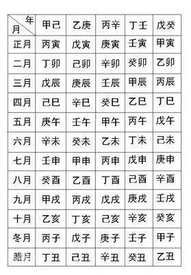 由年天干推月干支参见下图年上起月表。如果年干为甲或己,当年正月的干支为丙寅;如果年干为乙或庚,当年正月的干支为戊寅;如果年干为丙或辛,当年正月的干支为庚寅;如果年干为丁或壬,当年正月的干支为壬寅;如果年干为戊或癸,当年正月的干支为甲寅。